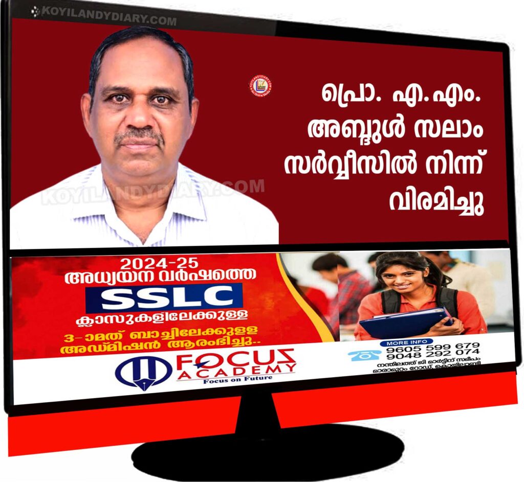 കൊയിലാണ്ടി: ആർ.ശങ്കർ മെമ്മോറിയൽ എസ്.എൻ.ഡി പി യോഗം കോളേജിലെ ഹിസ്റ്ററി വിഭാഗം മേധാവിയും അസ്സോസിയേറ്റ് പ്രൊഫസറുമായ എ.എം അബ്ദുൽ സലാം സർവ്വീസിൽ നിന്ന് വിരമിച്ചു. കാലിക്കറ്റ് സർവ്വകലാശാല ഹിസ്റ്ററി ബോർഡ് ഓഫ് സ്റ്റഡീസ് മെമ്പറായും, ഇൻസ്പെക്ഷൻ കമ്മിറ്റി അംഗമായും പ്രവർത്തിച്ചിട്ടുണ്ട്.