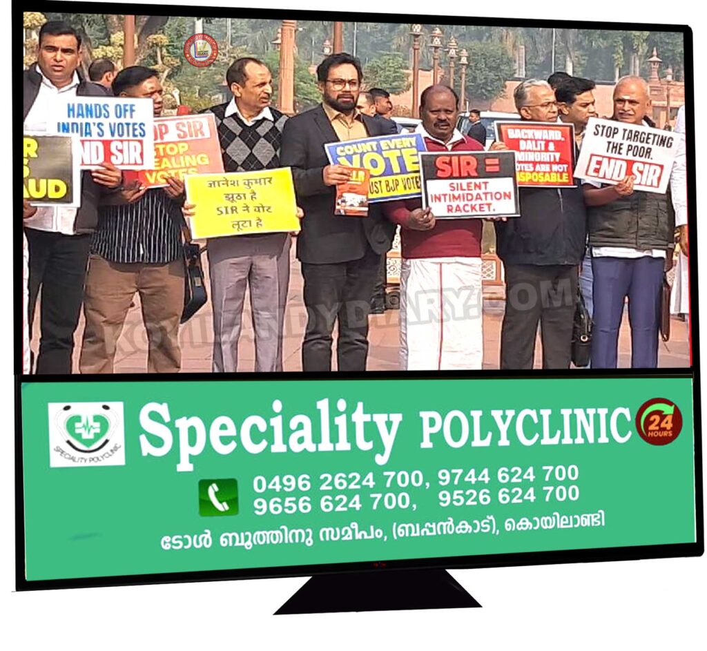 തീവ്ര വോട്ടർപട്ടിക പരിഷ്കരണം: സഭയില് ചര്ച്ച വേണമെന്ന് ആവശ്യപ്പെട്ട് പാർലമെൻ്റ് വളപ്പിൽ പ്രതിഷേധിച്ച് പ്രതിപക്ഷ എം പിമാർ