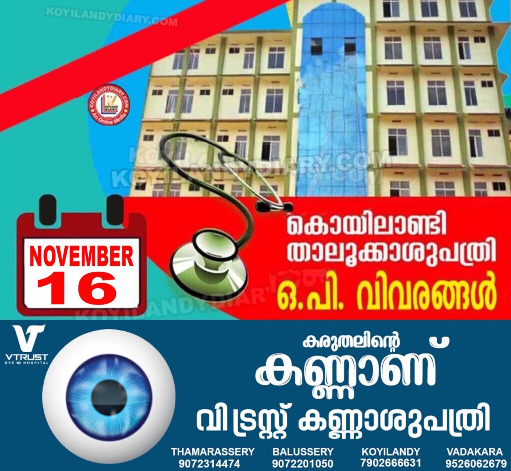 കൊയിലാണ്ടി താലൂക്കാശുപത്രിയിൽ നവംബർ 16 ശനിയാഴ്ചത്തെ ഒ.പി.യിൽ ലഭിക്കുന്ന സേവനങ്ങളെക്കുറിച്ചുള്ള വിവരങ്ങൾ. സി.ടി. സ്കാൻ പ്രവർത്തനസജ്ജം.