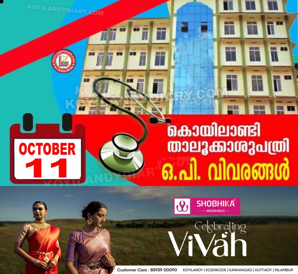 കൊയിലാണ്ടി താലൂക്കാശുപത്രിയിൽ ഒക്ടോബര് 11 ശനിയാഴ്ചത്തെ ഒ.പിയില് ലഭിക്കുന്ന സേവനങ്ങളെക്കുറിച്ചുള്ള വിവരങ്ങള്..