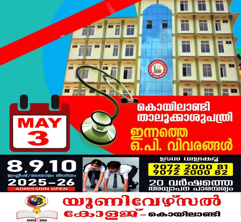 കൊയിലാണ്ടി താലൂക്കാശുപത്രിയിൽ മെയ് 03 ശനിയാഴ്ചത്തെ ഒ.പിയില് ലഭിക്കുന്ന സേവനങ്ങളെക്കുറിച്ചുള്ള വിവരങ്ങള്..