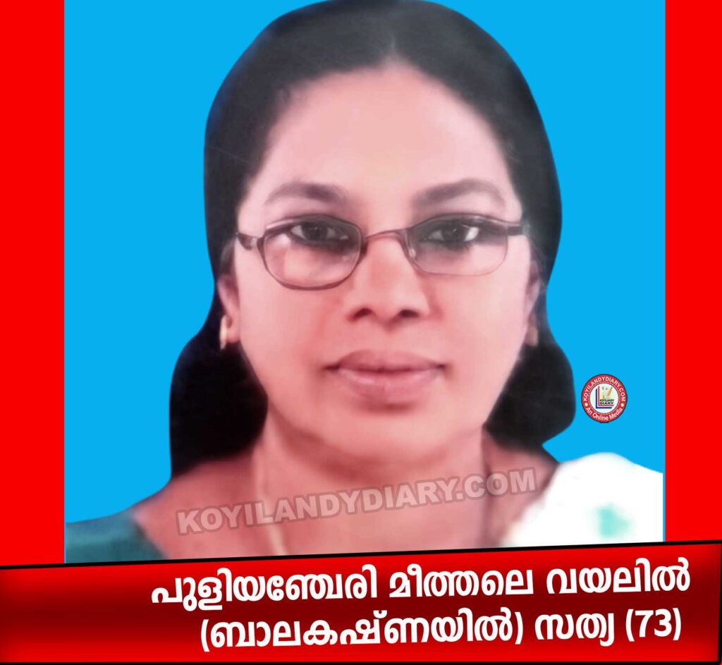 കൊയിലാണ്ടി: പുളിയഞ്ചേരി, മീത്തലെ വലിയ വയലിൽ ”ബാലകൃഷ്ണ”യിൽ സത്യ (73) നിര്യാതയായി. പുളിയഞ്ചേരി യു. പി. സ്കൂൾ മുൻ അധ്യാപികയായിരുന്നു. ഭർത്താവ്: പരേതനായ മീത്തലെ വലിയ വയലിൽ ബാലകൃഷ്ണൻ. മക്കൾ:. ബൈജു. എം. വി, ഷൈജു. എം. വി, സ്മിത. എം. വി. മരുമക്കൾ: ജിജിന, നിത്യ, ബൈജു. സഹോദരങ്ങൾ: