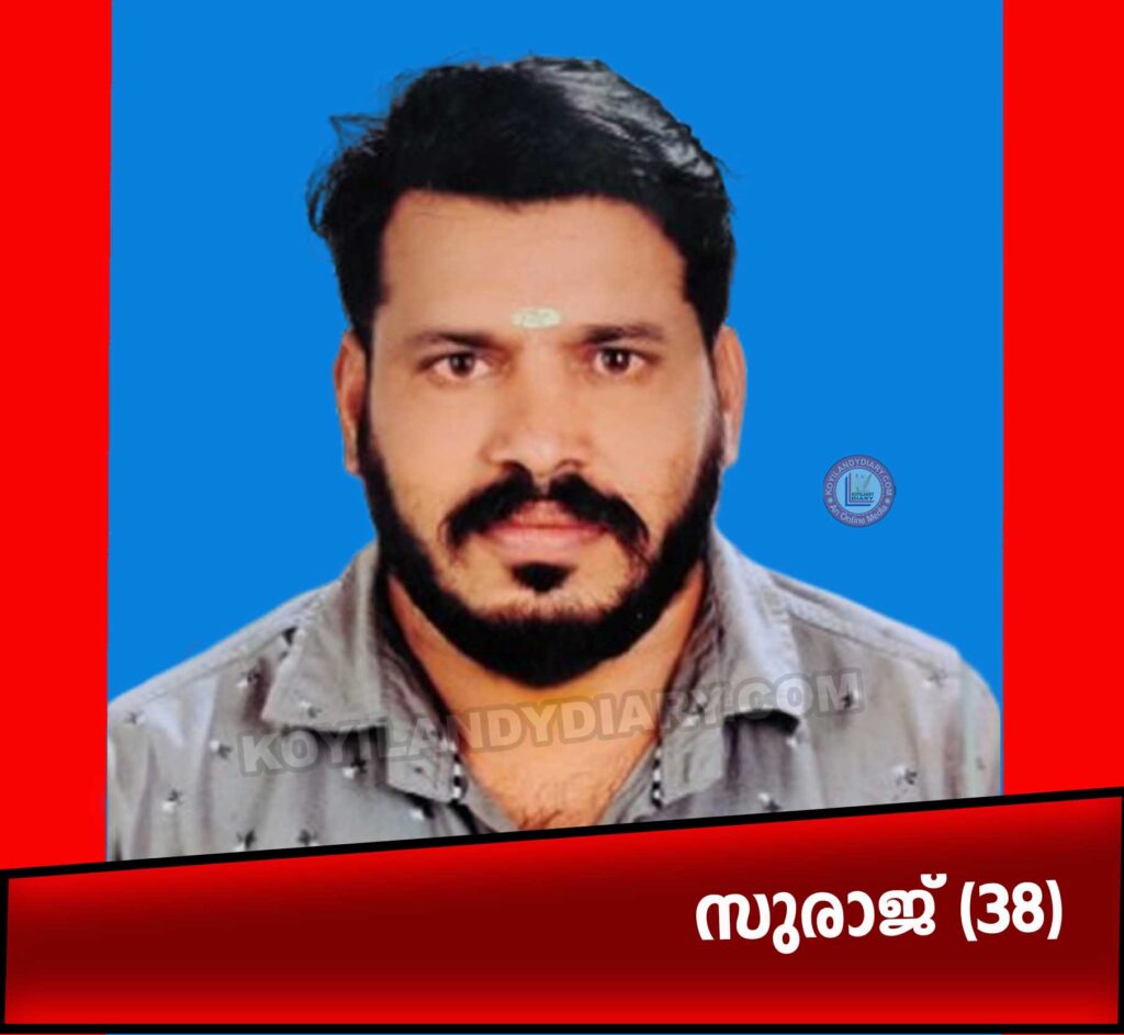 Koyilandy News Obituary ഗുരുകുലം ബീച്ചിൽ പുത്തൻ കടപ്പുറത്ത് സുരാജ് (38) നിര്യാതനായി 2 hours ago koyilandydiary . കൊയിലാണ്ടി: ഗുരുകുലം ബീച്ചിൽ പുത്തൻ കടപ്പുറത്ത് പരേതനായ രാജൻ്റെ മകൻ സുരാജ് (38) നിര്യാതനായി. അമ്മ: ശോഭന. സഹോദരിമാർ: ശോലിത, അനു, സോണിയ. Share news Post navigation Previous ചേമഞ്ചേരി വെങ്ങളം പെരുപ്പാംവയൽ മീനാക്ഷി (75) നിര്യതയായിNext പന്തലായനി കിഴക്കെ വീട്ടില് പത്മനാഭന് നായർ (92) നിര്യാതനായി