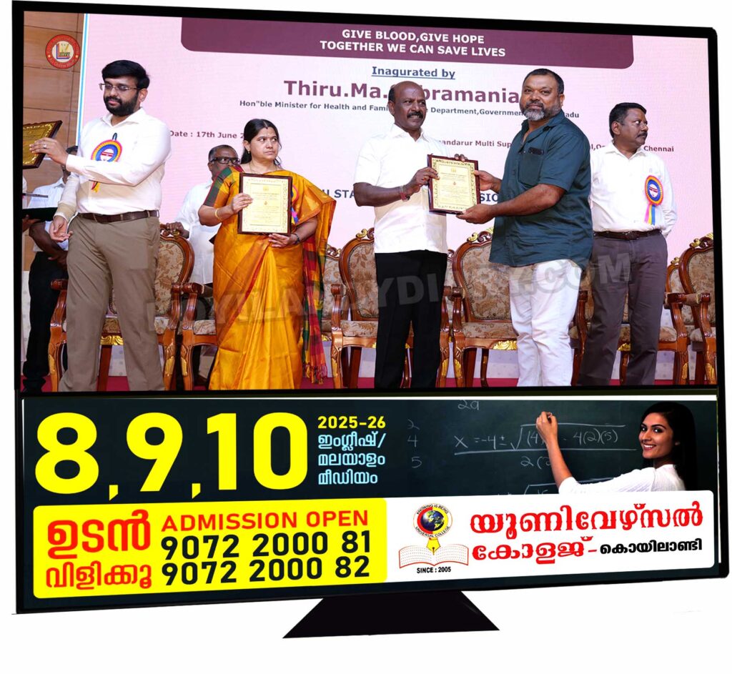 രക്തദാനത്തിന് തമിഴ്നാട് സർക്കാരിന്റെ വക അവാർഡ്. ലോക രക്തദാന ദിനം പ്രമാണിച്ച് തമിഴ്നാട് സർക്കാരിന്റെ കീഴിലുള്ള തമിഴ്നാട് സ്റ്റേറ്റ് ബ്ലഡ് ട്രാൻസ്ഫർ കമ്മിറ്റിയുടെ ആഭിമുഖ്യത്തിൽ നടന്ന പരിപാടിയിൽ അൻപതിൽ അധികം തവണ തുടർച്ചയായി രക്തദാനം നൽകിയ സന്നദ്ധ പ്രവർത്തകർക്ക് അവാർഡുകൾ നൽകി.