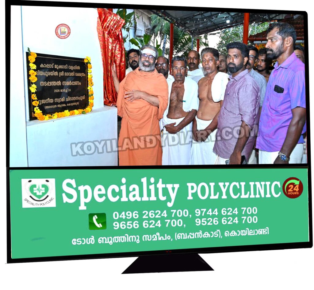 കൊയിലാണ്ടി: കാപ്പാട് മുക്കാടി വളപ്പിൽ വലിയപുരയിൽ ശ്രീ ഭഗവതി ക്ഷേത്രത്തിൽ പുതുതായി നിർമ്മിച്ച നടപ്പന്തൽ സമർപ്പണം പൂജനീയ ചിദാനന്ദപുരി സ്വാമികൾ നിർവഹിച്ചു. ക്ഷേത്ര കമ്മിറ്റി പ്രസിഡണ്ട് ടി. പി ശിവദാസൻ അധ്യക്ഷത വഹിച്ചു. ക്ഷേത്ര കമ്മിറ്റി സെക്രട്ടറി ജിതേഷ് കാപ്പാട്, എം വി, രഘു, കെ. പി ഉണ്ണികൃഷ്ണൻ എന്നിവർ സംസാരിച്ചു. നിരവധി ഭക്തജനങ്ങൾ ചടങ്ങിൽ പങ്കെടുത്തു.