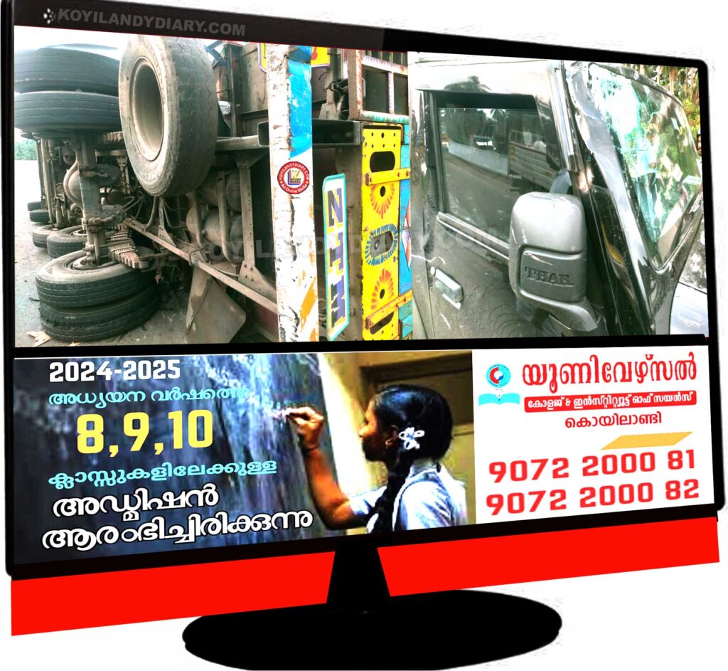 കൊയിലാണ്ടി ദേശീയ പാതയിൽ ടയർ പൊട്ടി ലോറി മറിഞ്ഞു