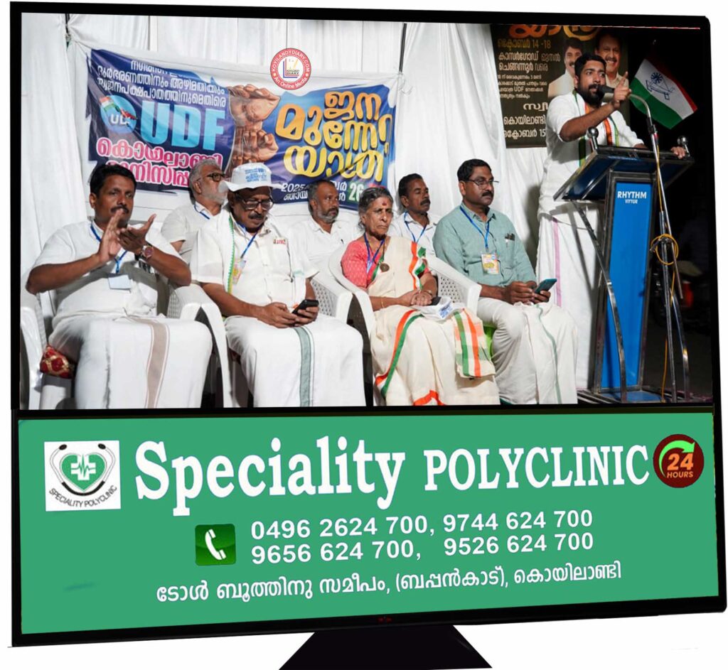 കൊയിലാണ്ടി നഗരസഭയിൽ എൽഡിഎഫ് ദുർഭരണമാണെന്നാരോപിച്ച് UDF നഗരസഭ കമ്മിറ്റിയുടെ നേതൃത്വത്തിൽ നടത്തിയ ജന മുന്നേറ്റ പദയാത്ര സമാപിച്ചു. 26, 27 തിയ്യതികളിലായി നടന്ന യാത്രയുടെ സമപാന സമ്മേളനം യൂത്ത് കോൺഗ്രസ്സ് ദേശിയ സെക്രട്ടറി കെ. എം. അഭിജിത്ത് ഉദ്ഘാടനം ചെയ്തു. പി. രത്നവല്ലി ടീച്ചർ, വി.പി. ഇബ്രാഹിം കുട്ടി, അൻവർ ഇയ്യഞ്ചേരി, കെ.പി. വിനോദ് കുമാർ, അഡ്വ. കെ.വിജയൻ, എ. അസ്സീസ്, വി.വി. സുധാകരൻ, കെ.യം. നജീമ്പ്, വി.ടി. സുരേന്ദ്രൻ, തൻഹീർ കൊല്ലം, രജീഷ് വെങ്ങളത്ത് കണ്ടി എന്നിവർ സംസാരിച്ചു.