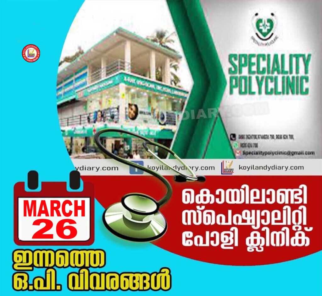 കൊയിലാണ്ടി സ്പെഷ്യാലിറ്റി പോളിക്ലിനിക്കിൽ മാർച്ച്‌ 26 വ്യാഴാഴ്ച പ്രവർത്തിക്കുന്ന ഒപികളും ഡോക്ടർമാരും സേവനങ്ങളും..