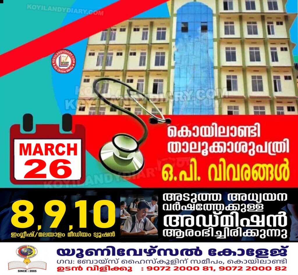 കൊയിലാണ്ടി താലൂക്ക് ആശുപത്രിയിൽ മാര്‍ച്ച് 26 വ്യാഴാഴ്ചത്തെ ഒ.പി.യിൽ ലഭിക്കുന്ന സേവനങ്ങൾ..