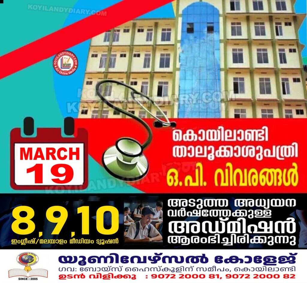 കൊയിലാണ്ടി താലൂക്ക് ആശുപത്രിയിൽ മാര്‍ച്ച് 19 വ്യാഴാഴ്ചത്തെ ഒ.പി.യിൽ ലഭിക്കുന്ന സേവനങ്ങൾ..