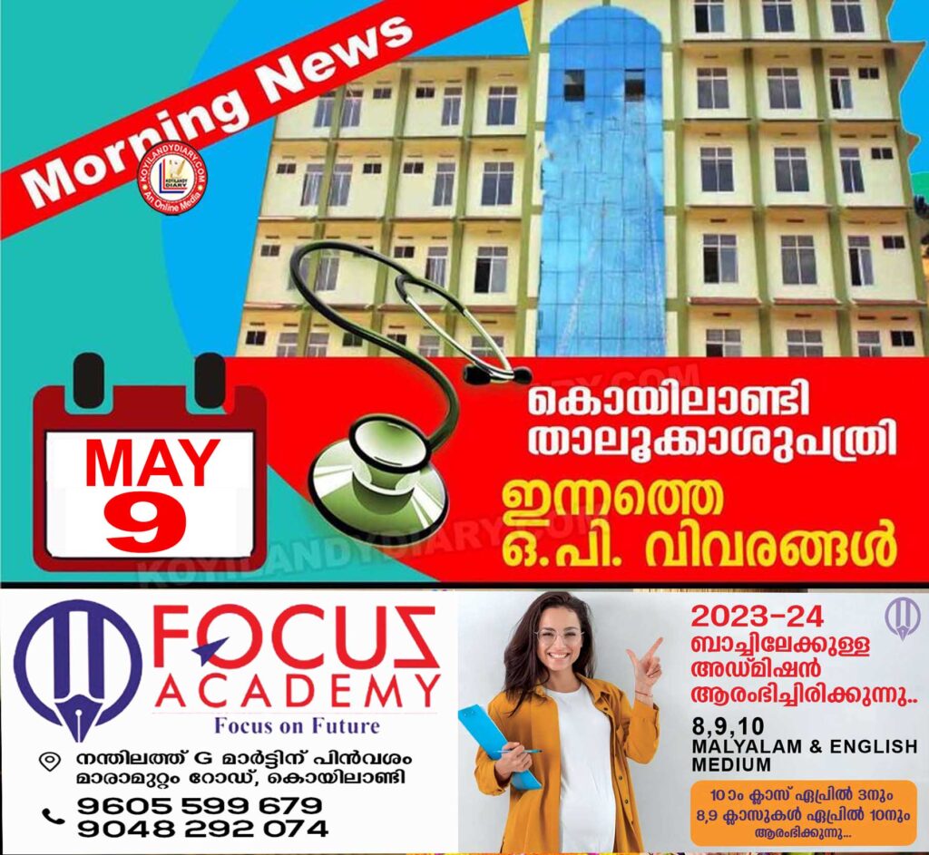 കൊയിലാണ്ടി താലൂക്കാശുപത്രിയിലെ ഇന്നത്തെ (മെയ് 9 ചൊവ്വാഴ്ച) ഒ.പി.യിൽ ലഭിക്കുന്ന സേവനങ്ങളെക്കുറിച്ചുള്ള വിവരങ്ങൾ. സി.ടി. സ്കാൻ പ്രവർത്തനസജ്ജം.