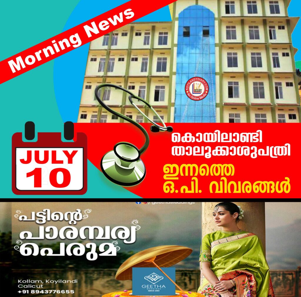 കൊയിലാണ്ടി താലൂക്കാശുപത്രിയിലെ ഇന്നത്തെ (ജൂലായ് 10 തിങ്കളാഴ്ച) ഒ.പി.യിൽ ലഭിക്കുന്ന സേവനങ്ങളെക്കുറിച്ചുള്ള വിവരങ്ങൾ. സി.ടി. സ്കാൻ പ്രവർത്തനസജ്ജം.
