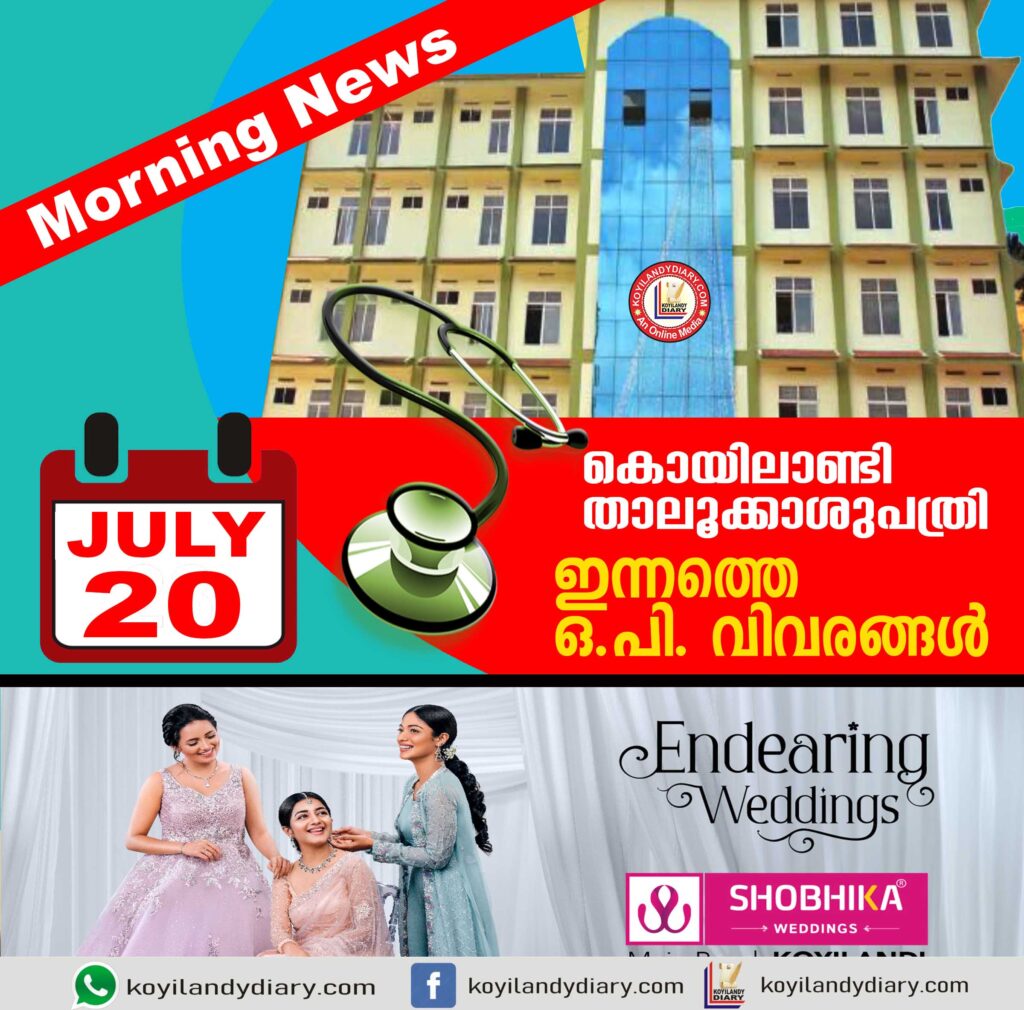 കൊയിലാണ്ടി താലൂക്കാശുപത്രിയിലെ ഇന്നത്തെ (ജൂലായ് 20 വ്യാഴാഴ്ച) ഒ.പി.യിൽ ലഭിക്കുന്ന സേവനങ്ങളെക്കുറിച്ചുള്ള വിവരങ്ങൾ. സി.ടി. സ്കാൻ പ്രവർത്തനസജ്ജം.