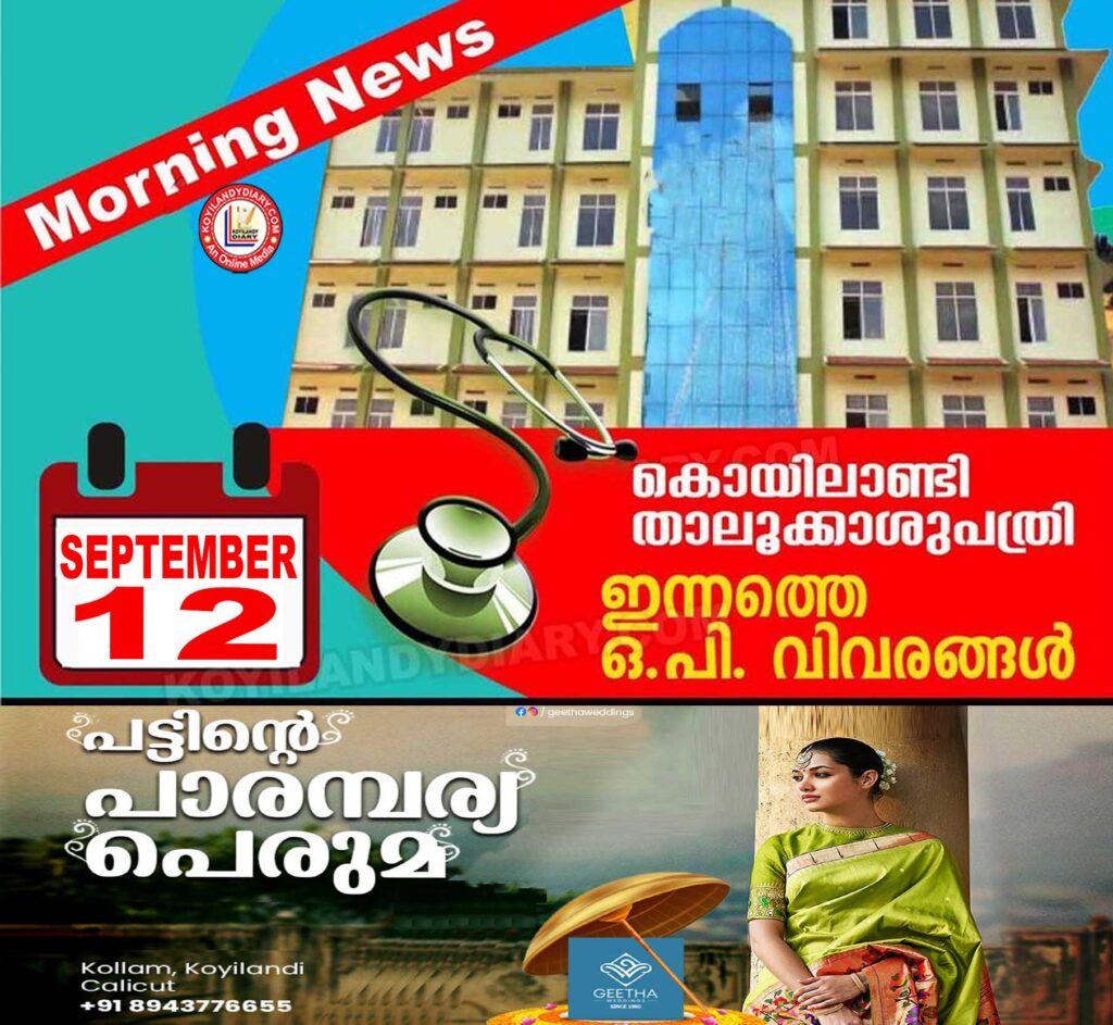 കൊയിലാണ്ടി താലൂക്കാശുപത്രിയിലെ ഇന്നത്തെ (സപ്തംബർ 12 ചൊവ്വാഴ്ച) ഒ.പി.യിൽ ലഭിക്കുന്ന സേവനങ്ങളെക്കുറിച്ചുള്ള വിവരങ്ങൾ. സി.ടി. സ്കാൻ പ്രവർത്തനസജ്ജം.
