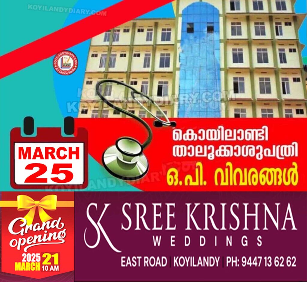 കൊയിലാണ്ടി താലൂക്കാശുപത്രിയിൽ മാര്ച്ച് 25 ചൊവ്വാഴ്ചത്തെ ഒ.പിയില് ലഭിക്കുന്ന സേവനങ്ങളെക്കുറിച്ചുള്ള വിവരങ്ങള്..