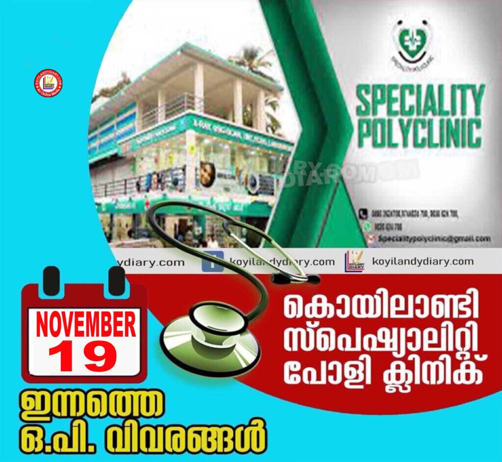 കൊയിലാണ്ടി സ്പെഷ്യാലിറ്റി പോളിക്ലിനിക്കിൽ നവംബർ 19 ചൊവ്വാഴ്ച പ്രവർത്തിക്കുന്ന ഒപികളും ഡോക്ടർമാരും സേവനങ്ങളും..