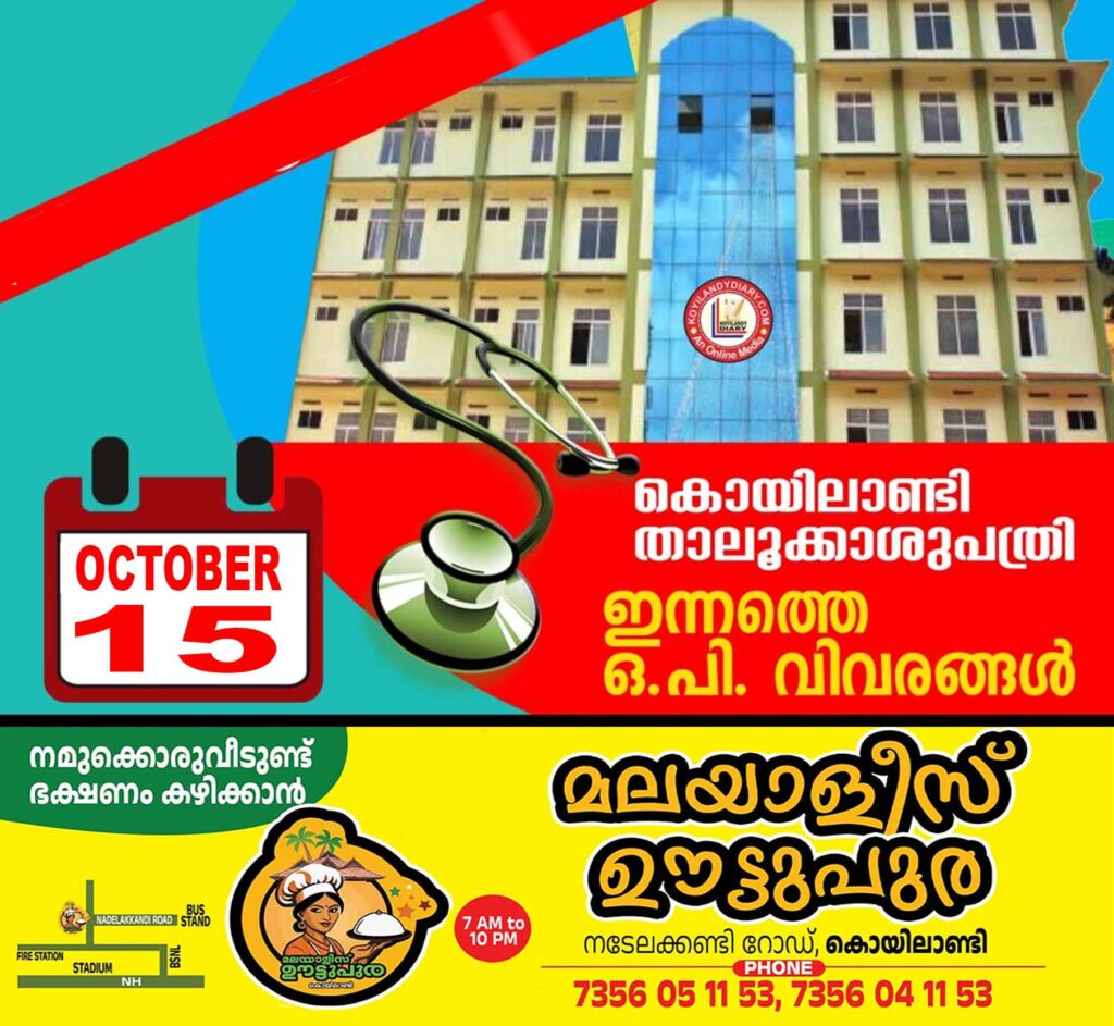 കൊയിലാണ്ടി താലൂക്കാശുപത്രിയിൽ ഒക്ടോബർ 15 ചൊവ്വാഴ്ചത്തെ ഒ.പി.യിൽ ലഭിക്കുന്ന സേവനങ്ങളെക്കുറിച്ചുള്ള വിവരങ്ങൾ. സി.ടി. സ്കാൻ പ്രവർത്തനസജ്ജം.