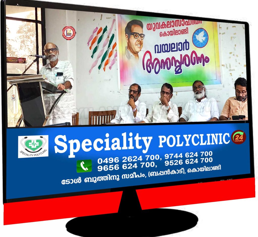 എഴുത്തുകാരനും പ്രഭാഷകനുമായ ശശികുമാർ പുറമേരി മുഖ്യപ്രഭാഷണം നടത്തി. രാഗം മുഹമ്മദലി അധ്യക്ഷത വഹിച്ചു. പ്രദീപ് കണിയാരിക്കൽ സ്വാഗതം പറഞ്ഞു. അഡ്വ. ശ്രീനിവാസൻ, നാസർ കാപ്പാട്, കെ എസ് രമേശ് ചന്ദ്ര, വിജയഭാരതി ടീച്ചർ, ജ്യോതിലക്ഷ്മി, ശശി പുറക്കാട് എന്നിവര് സംസാരിച്ചു. വയലാറിന്റെ തെരഞ്ഞെടുക്കപ്പെട്ട പ്രശസ്ത ഗാനങ്ങളുടേയും കവിതകളുടേയും ആലാപനം നടത്തി.