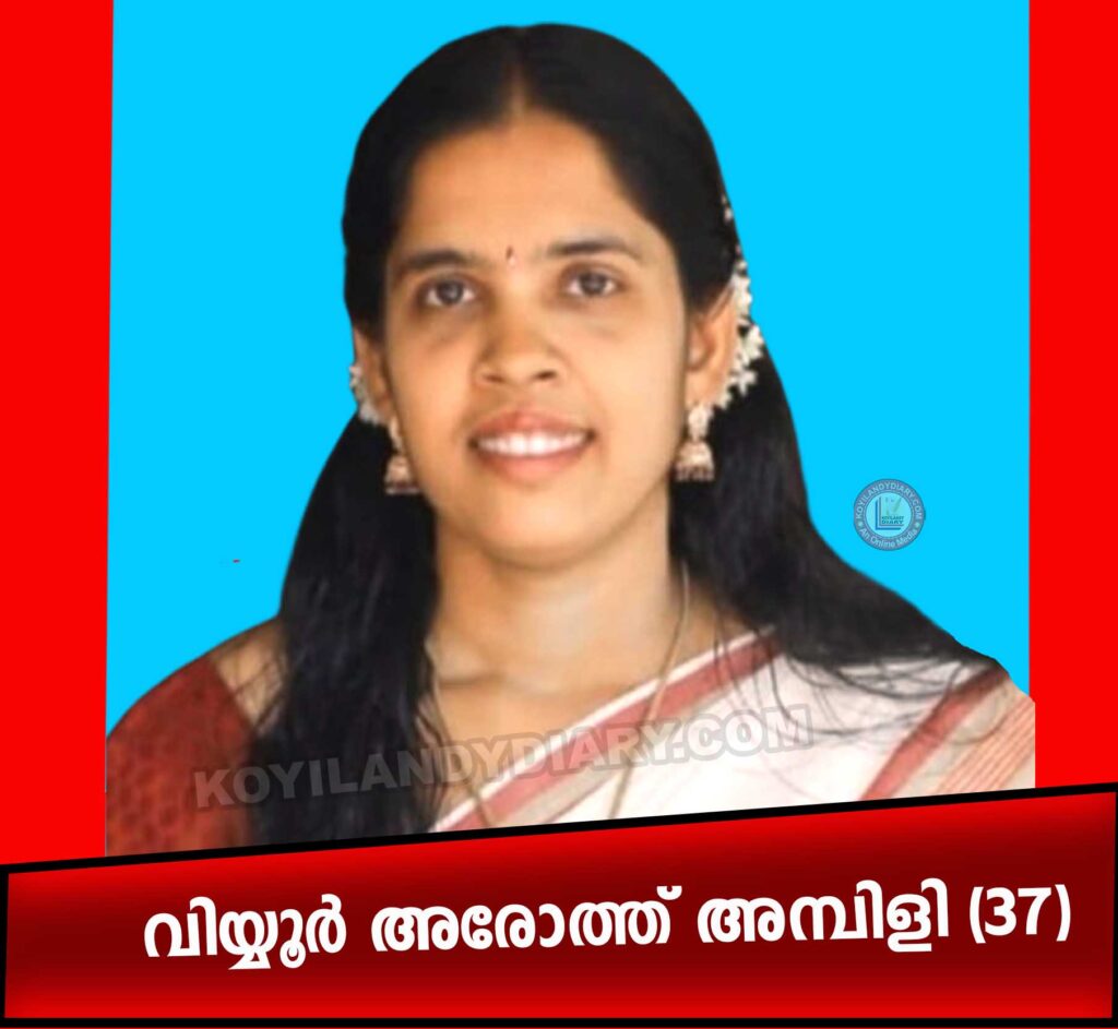 കൊയിലാണ്ടി: വിയ്യൂർ അരോത്ത് അമ്പിളി (37) നിര്യാതയായി. ഭർത്താവ്: റെലീഷ് ബാബു (തലശ്ശരി). രവീന്ദ്രന്റെയും (സിപിഎം വിയ്യൂർ നോർത്ത് അംഗം, സി ഐ ടി യു ഓട്ടോ സെക്ഷൻ കൊയിലാണ്ടി) പ്രേമലതയുടെയും മകളാണ്. സഹോദരങ്ങൾ: രജീഷ്, രജില (സ്റ്റാഫ് നഴ്സ് താലുക്ക് ആശുപത്രി കൊയിലാണ്ടി).