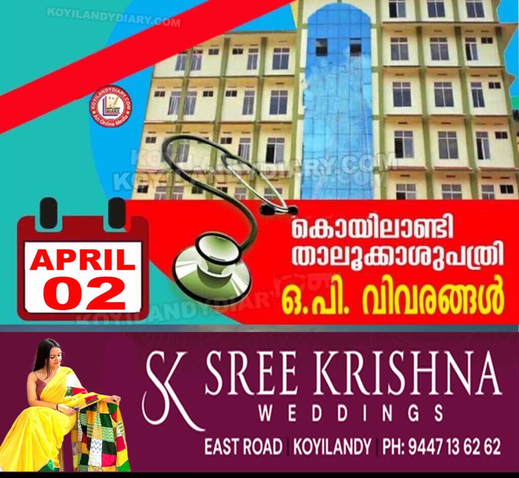 കൊയിലാണ്ടി താലൂക്കാശുപത്രിയിൽ ഏപ്രില് ൦2 ബുധനാഴ്ചത്തെ ഒ.പിയില് ലഭിക്കുന്ന സേവനങ്ങളെക്കുറിച്ചുള്ള വിവരങ്ങള്..